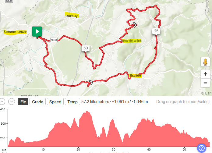 De aanloop is vlak en volgt de Ourthe voor een groot deel. Vanaf km 10 beginnen de klimmetjes en die volgen elkaar in sneltempo op. We komen voorbij de charmante dorpjes als Ny en Soy