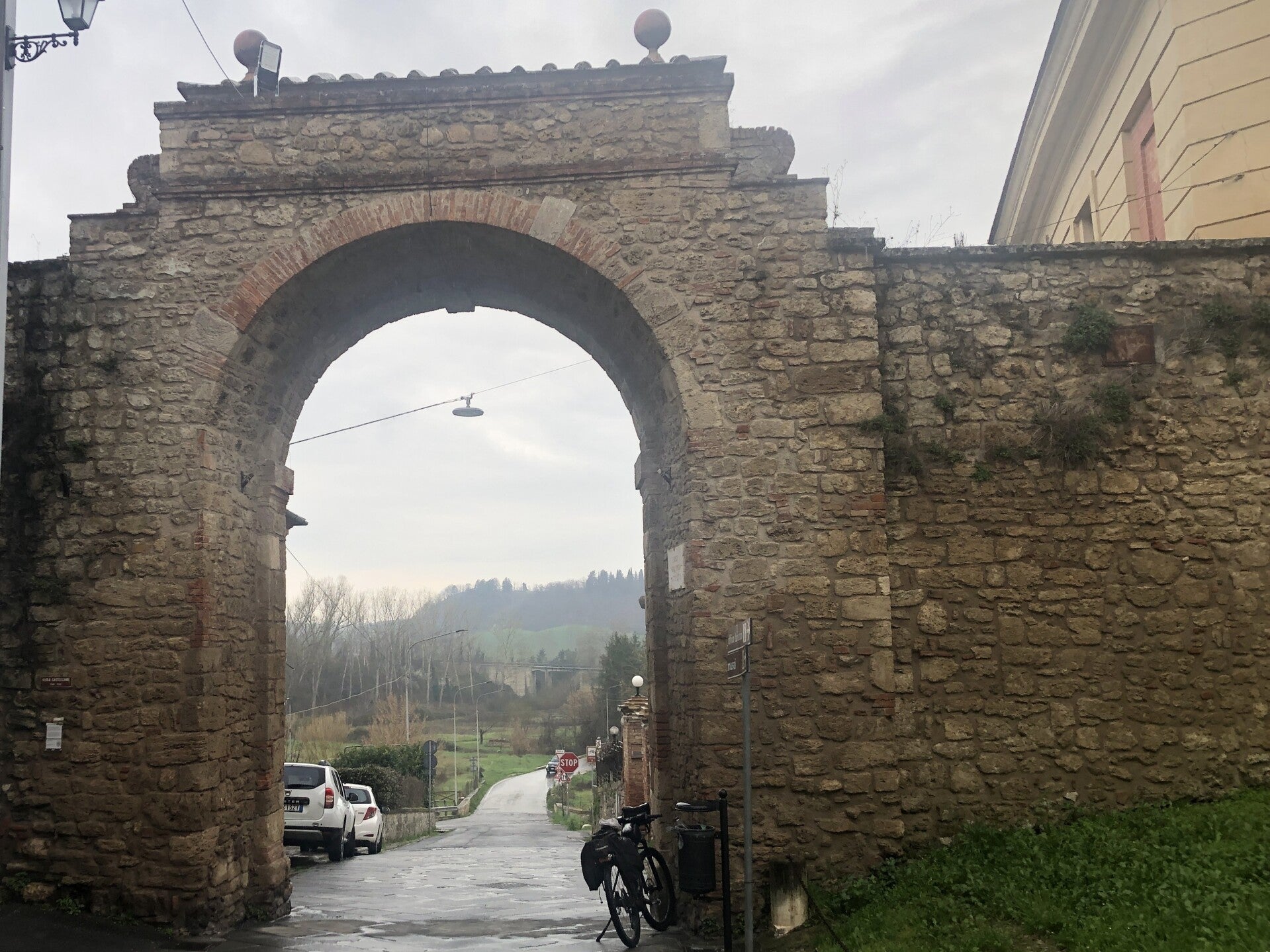 Aan km 55 arriveer ik in Castiglione d'Orcia, een plek die normaal bekend staat om zijn adembenemende uitzichten. Helaas hangt er vandaag een lichte mist, waardoor het uitzicht enigszins wordt belemmerd.