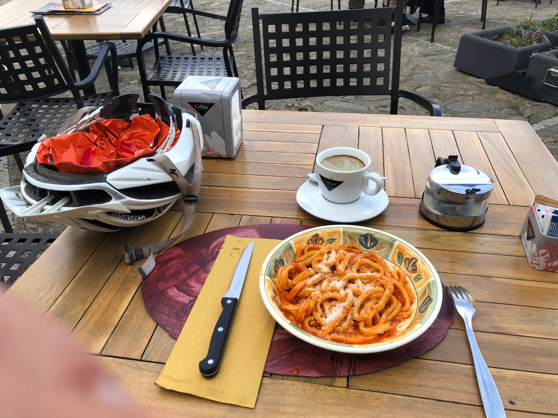 Ik heb honger en boven op het pleintje van Monteriggione eet ik een flink gekruide pasta ragù.