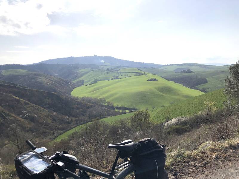 Op 15 km van Volterra besluit ik om van de hoofdweg af te wijken en een extra omweg te maken. Het is een mooi maar redelijk technisch gravelpad dat 8 km in dalende lijn gaat tot in het dorpje Prato D'era. Ik zie Volterra hoog in de verte liggen, als een arendsnest. Er rest me nog een steil asfaltweggetje van 5 kilometer, dat kronkelend door het bos omhoog slingert.