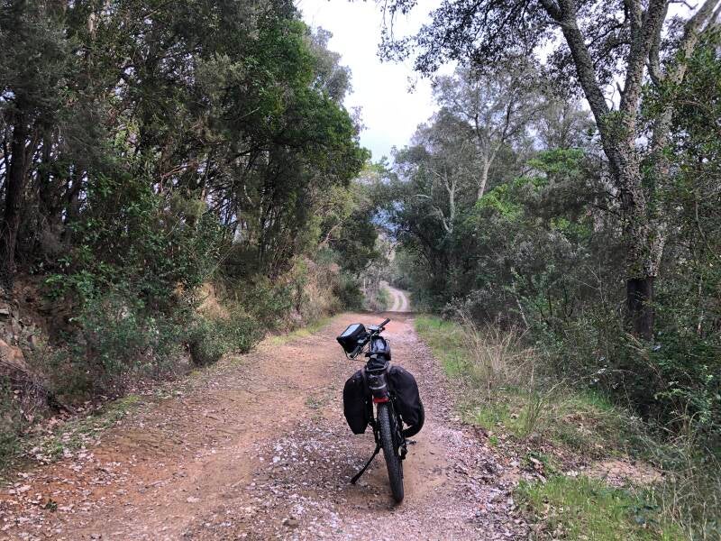 Ik fiets verder op de kust-fietsroute Ciclovia Tirrenica, een route van Ventimiglia (Franse grens) naar Rome. Ik kom op een prachtig gravelpad in een dennenbos dat kronkelend de kust volgt en prachtige uitzichten biedt.